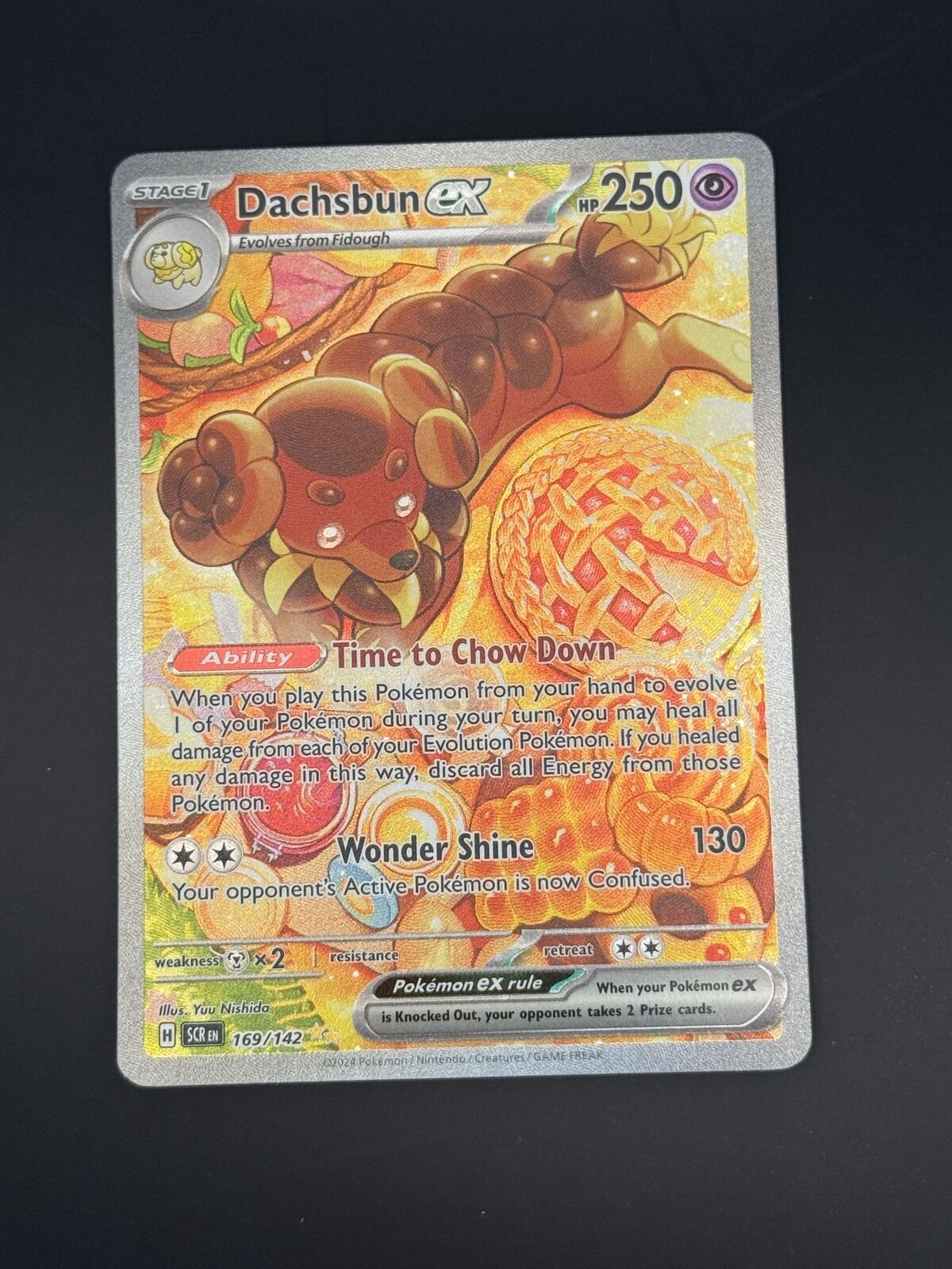 Hey there, Pokémon trainer! You’ve stumbled upon a gem. .. Dachsbun ex from Stellar Crown. Whether you’re battling or collecting, this card is a must-have. It’s the perfect addition to your deck or collection! Card is in Near Mint or Better condition. Extra photos are available upon request. We pack each card with love in a top loader, team bag, and a pull tab. We take pride in quick shipments and you have your choice of shipping via eBay standard envelope (for cards less than $20) or USPS Ground Advantage. We’re not just sellers. we’re fellow Pokémon enthusiasts. Got questions? Just ask!