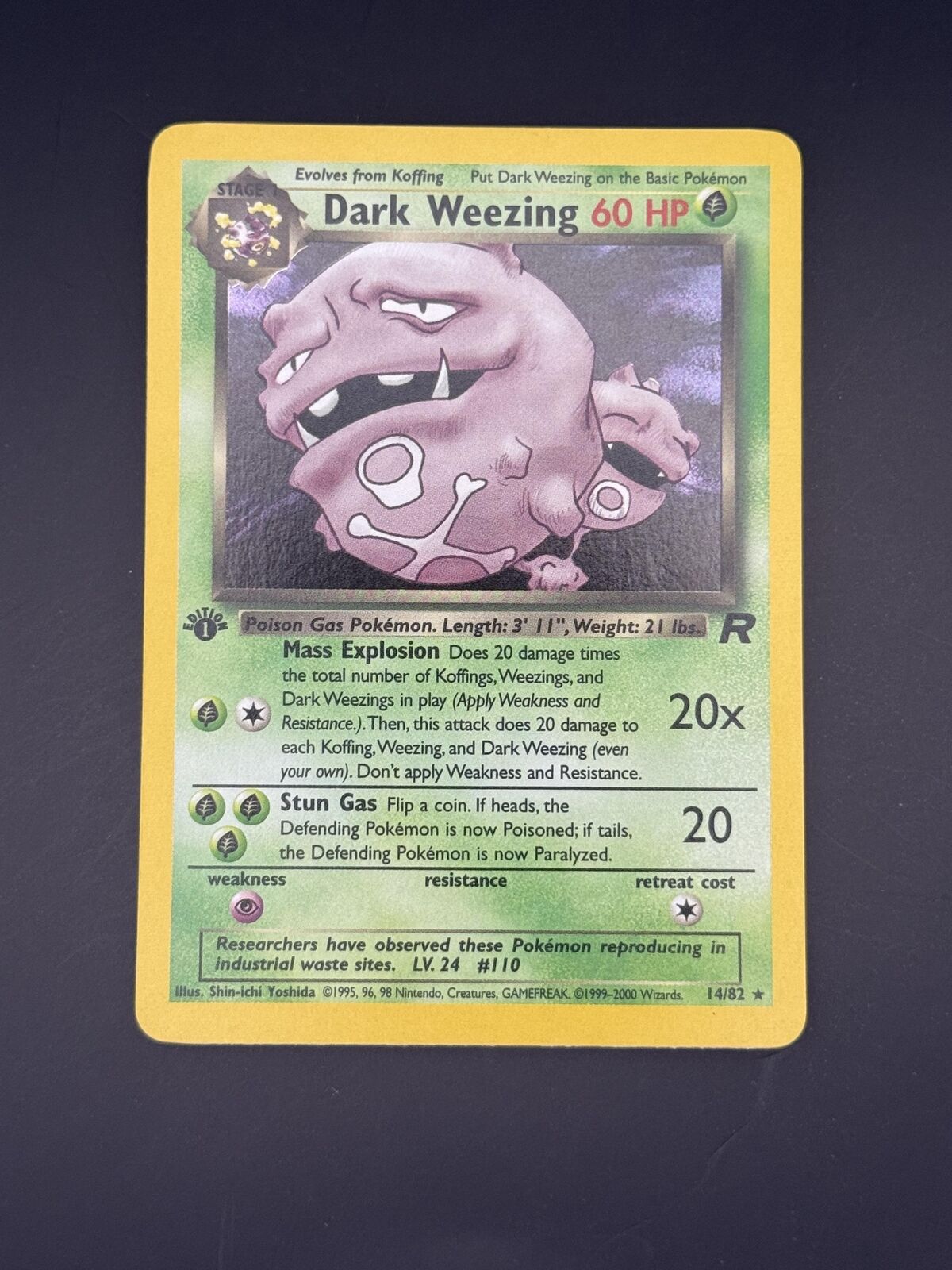 Hey there, Pokémon trainer! You’ve stumbled upon a gem. .. Dark Weezing (14) from Team Rocket. Whether you’re battling or collecting, this card is a must-have. It’s the perfect addition to your deck or collection! Card is in Near Mint or Better condition. Extra photos are available upon request. We pack each card with love in a top loader, team bag, and a pull tab. We take pride in quick shipments and you have your choice of shipping via eBay standard envelope (for cards less than $20) or USPS Ground Advantage. We’re not just sellers. we’re fellow Pokémon enthusiasts. Got questions? Just ask!